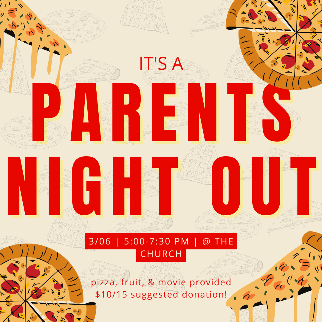 In a few weeks we’ll be having our next Parents Night Out! Come drop off your kids to enjoy a well-deserved night off. There will be pizza, fruit, and movies provided in the Vineyard Kids rooms, and the Women’s Ministry will be helping with childcare! A $10/15 donation is suggested to support their upcoming retreat in May!